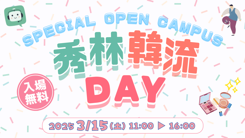1月, 水, 2025 shurin_admin_01 Uncategorized 秀林韓流DAY~スペシャルオープンキャンパス~のお知らせ 안녕하세요?여러분🇰🇷 3月15日(土)に行われる「秀林韓流DAY」についてお知らせいたします! 毎月開催しているオープンキャンパスとは違った目線で、”韓国”を体験できるイベントです🎉 参加予約はこちら Du học sinh cần GỌI ĐIỆN để đăng ký※通常の学校説明会とは異なります。 日時 【日時】3月15日(土) 【時間】11:00~16:00(入退場自由) 【場所】専門学校 デジタル&ランゲージ 秀林 【参加費】無料 【対象】どなたでも!(当校のオープンキャンパスに参加したことのある方などどなたでもご参加可能です◎✨) 【予約】事前予約可能◎ ⚠️1.予約なしでも当日ご参加いただけますが、入場時に体験するプログラムのアンケートにお答えいただきますので事前予約をしておくとスムーズにご入場いただけます。 ⚠️2.昼食の提供はございませんので、ご注意ください。 ⚠️3.2026年度入学者向け 学校説明会・入試相談会は14:00~開始されます。 その他のプログラムは11:00~14:00まで参加可能です◎ 16:00からは希望者に限り、在校生との交流会も行います!学校の雰囲気や普段の学校生活など在校生に聞くことができますのでこの機会にぜひご参加ください Comments (0)
